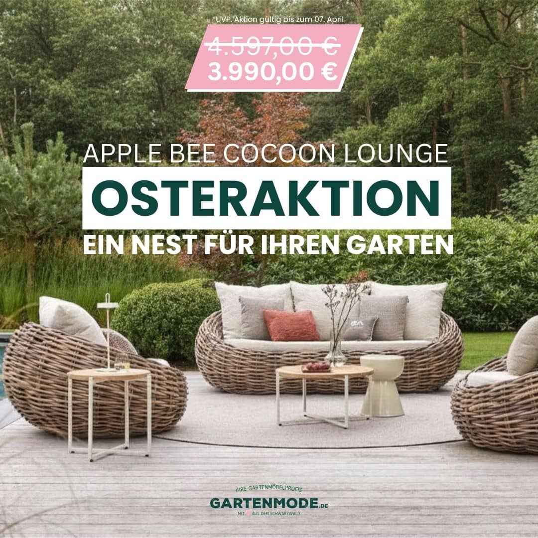 Ostern steht vor der Tür und mit den ersten warmen Tagen beginnt die neue Gartensaison. Jetzt ist der ideale Zeitpunkt, um Garten, Terrasse oder Balkon neu zu gestalten. Bei gartenmode.de erwartet Sie passend dazu eine besondere Osteraktion. Die hochwertige Cocoon Lounge von Apple Bee ist aktuell zu attraktiven Konditionen erhältlich.