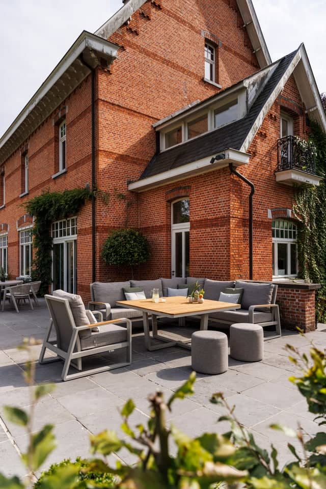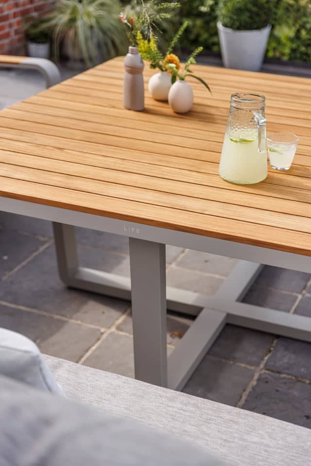 Das Set besteht aus langlebigem, witterungsbeständigem Aluminium mit integrierten Teakholzplanken. Es ist pflegeleicht und in zwei modernen Farben erhältlich: Beige-Aluminium für einen natürlichen Look und Lava-Aluminium für eine moderne, elegante Optik.